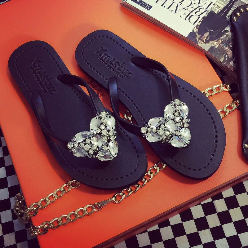 Mùa hè làn sóng mới của dép rhinestone nữ thời trang trượt dép kẹp phẳng Hàn Quốc và dép bãi biển ngọt ngào và đáng yêu