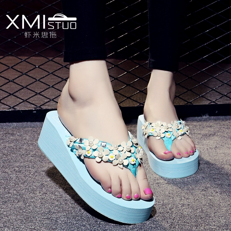 triều dốc thời trang mùa hè Hàn Quốc với đôi dép hoa rhinestone bãi biển và dép đi trong nhà không trượt nặng đáy Muffin nữ dép dễ thương